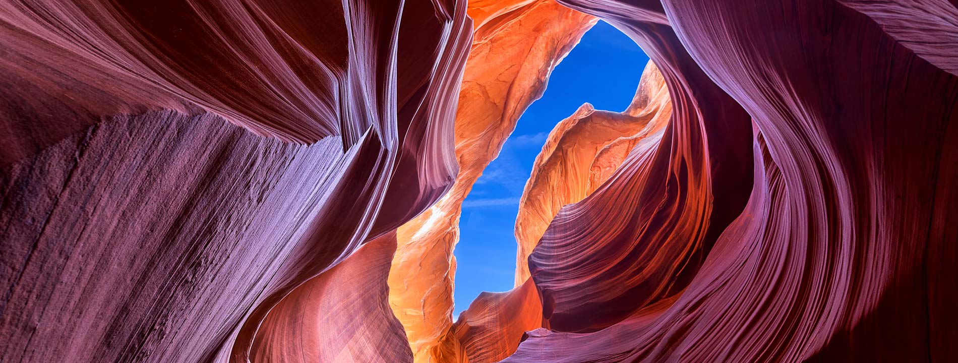 È il canyon di arenaria più fotografato del nord dell’Arizona. Per la tonalità cromatica, che varia dall’arancione al viola a seconda di come la luce entra e si riflette all’interno, e per le forme vertiginose create dall’acqua e dal vento, è uno spettacolo unico al mondo. Stretto ma facilmente percorribile, si divide in Upper e Lower Antelope Canyon: il primo più famoso e frequentato dai turisti, il secondo più impegnativo e meno visitato. Il periodo migliore per la visita è in estate ma ricordatevi che la prenotazione è obbligatoria.